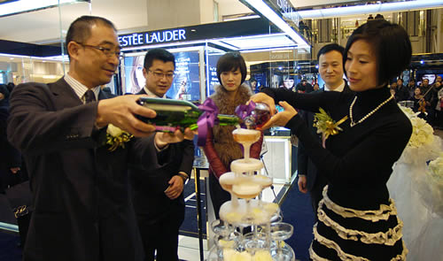 雙方領導共同為慶祝雅詩蘭黛盛裝入駐蘭州國芳百貨倒入香檳