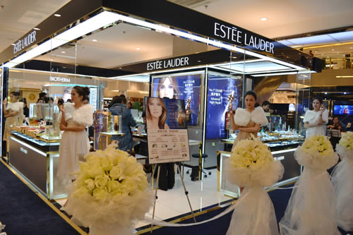 剪彩現場,禮儀小姐為顧客展示雅詩蘭黛明星產品