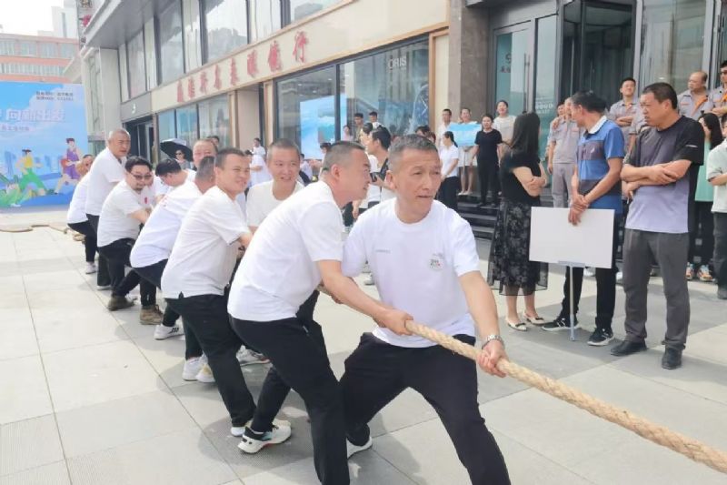 拔河比賽中,兩隊隊員緊握粗繩,腳蹬地面,身體后傾。哨聲一響,雙方齊聲吶喊,全力拉扯,臉漲得通紅。中間紅綢左右晃動,勝負難分,啦啦隊助威聲震耳欲聾。每一次的拉扯都是力量的較量,每一次的堅持都是團隊精神的體現。