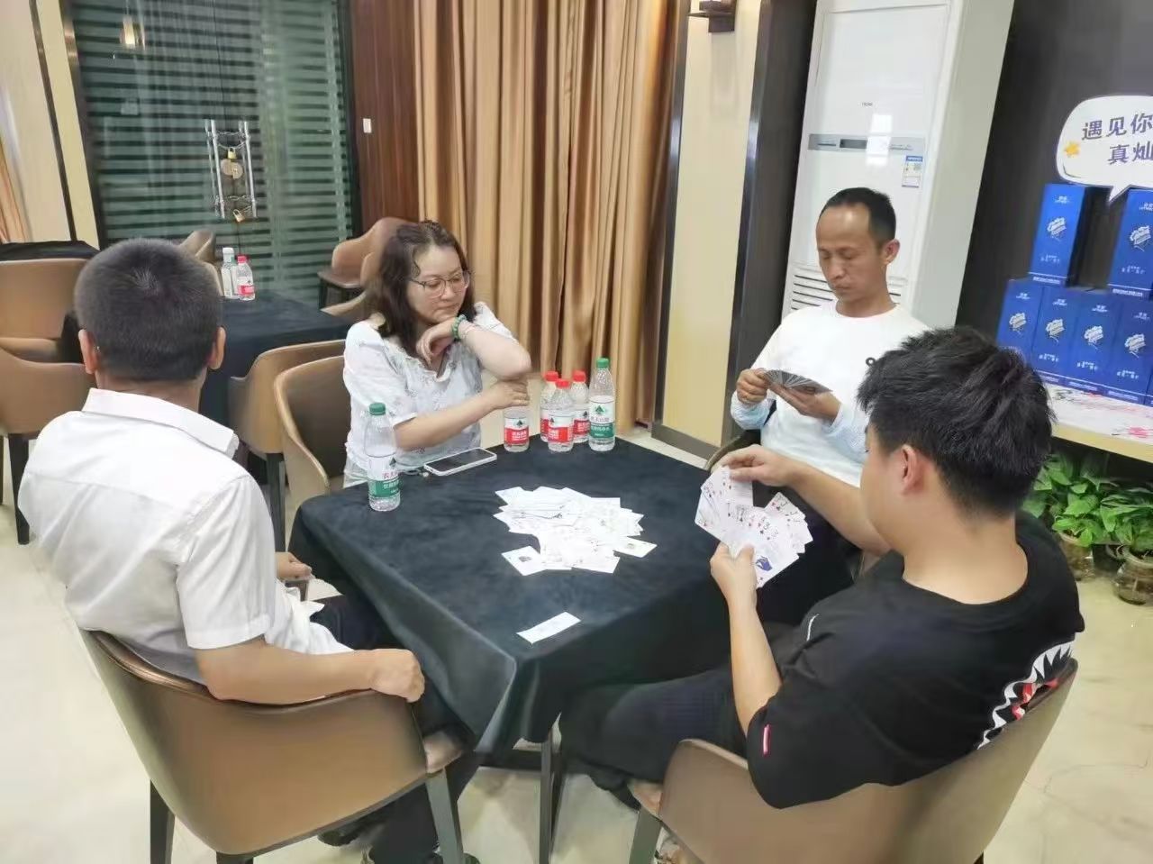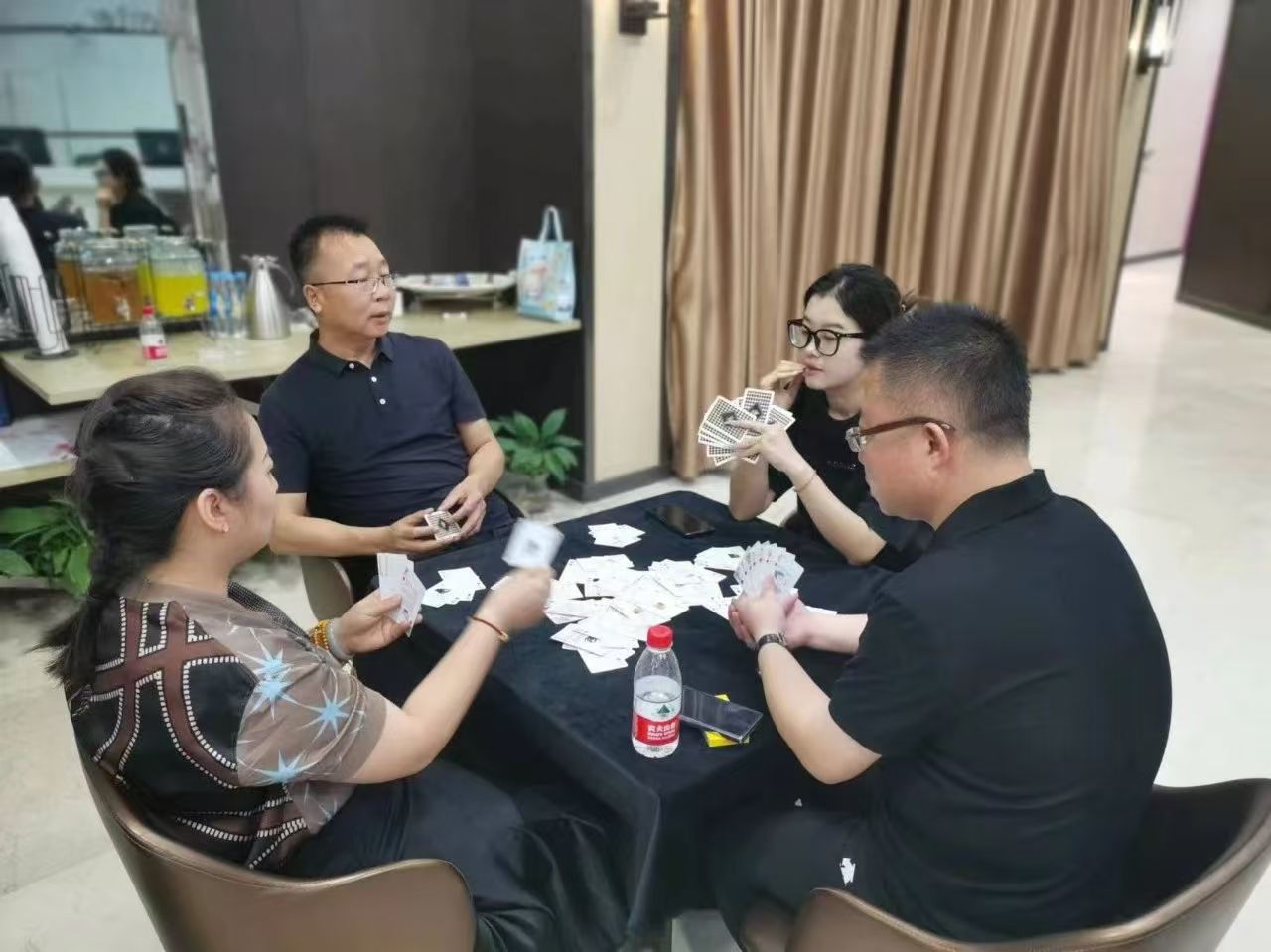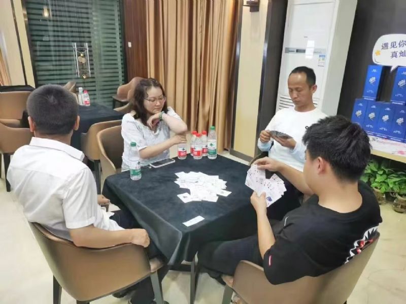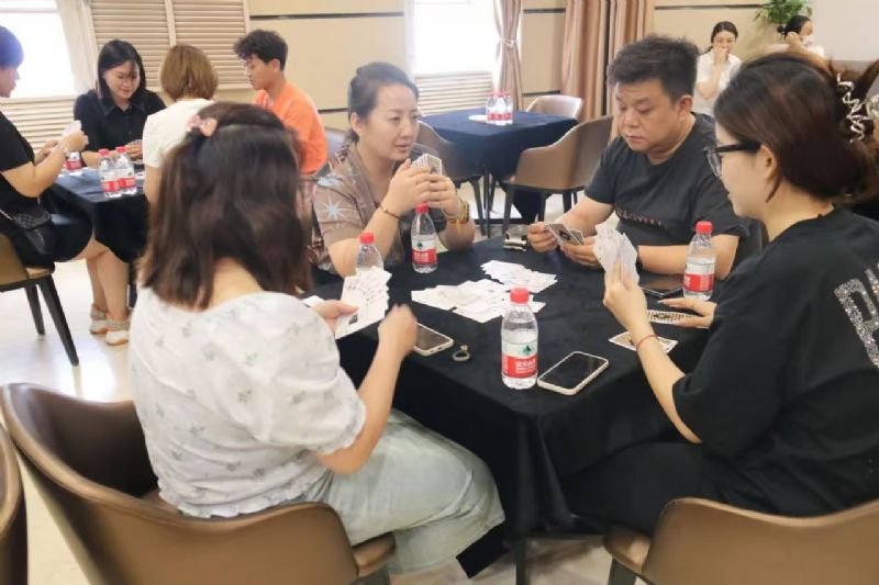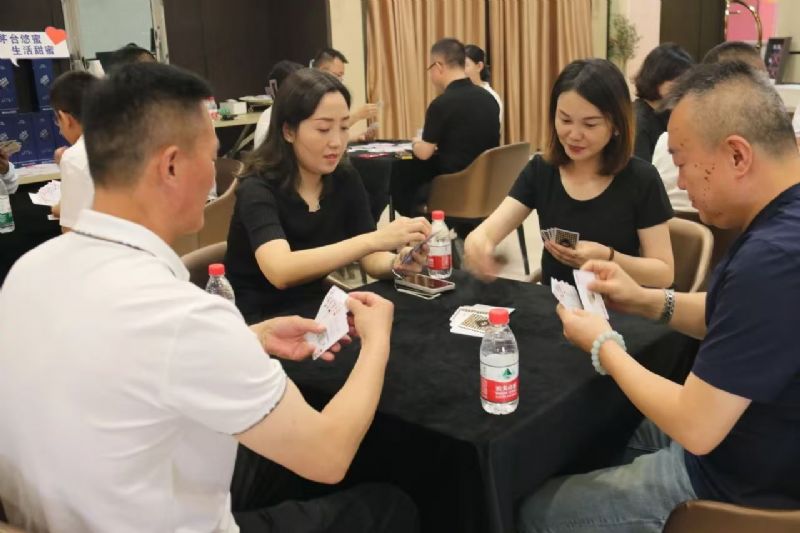 在運動會的摜蛋比賽現場,氣氛熱烈而又緊張。一張張牌桌整齊排列,參賽選手們兩兩相對而坐,神情專注而投入。他們的目光緊緊鎖住手中的牌,大腦飛速運轉,思考著出牌策略。每一次出牌都顯得深思熟慮,又充滿了果斷和自信。